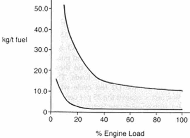 Like CO2 carbon monoxide emissions arise from the combustion of fossil fuel. CO2 comes from complete oxidation of the carbon in the fuel and CO results from incomplete combustion of the fuel due to local areas with shortage of air supply. In a normal compression ignition engine the excess air ratio is larger than 1 and thus the CO emission is generally low. Theoretically, if > 1 combustion will be complete and no CO will be formed. In practice this is not the case, and there is always CO present in the exhaust gas because there will be local areas with insufficient air supply to facilitate complete combustion. The CO emissions vary with engine load and for higher loads they are more or less constant as show in figure 44.