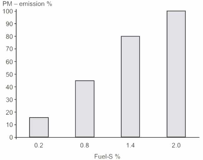 Particulates are a result of incomplete combustion, dirty fuel oil and imperfect lubrication of the cylinders. At low and transient loads soot can be a high contributor to the total PM emissions while at higher loads the fraction is much smaller. Because the PM emission depends on the load, the fuel oil composition, and the lubrication oil type and dosage it is difficult to establish general emission rates for PM. The sulphur content on the fuel has a large influence on the PM emissions as illustrated in figure 46.